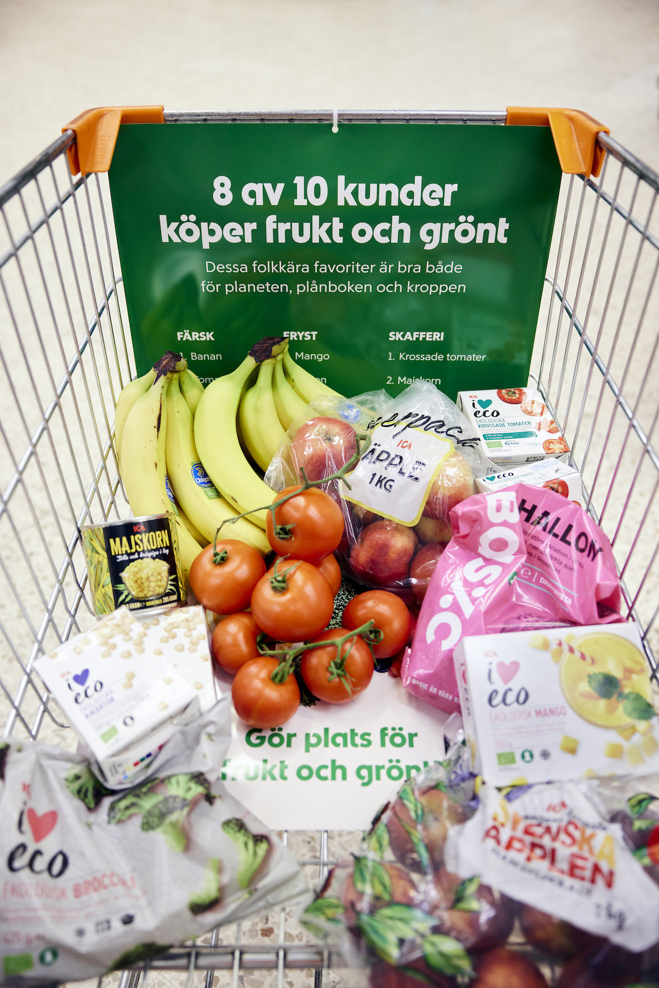Den andra insatsen som testades var att med hjälp av en dekal markera en plats i kundvagnen för frukt och grönt. Syftet var att både påminna om dessa varor men också göra kunden uppmärksam på vilka val hen gör i butiken. Denna insats gav tyvärr inga tydliga positiva effekter på försäljningen av frukt och grönt.